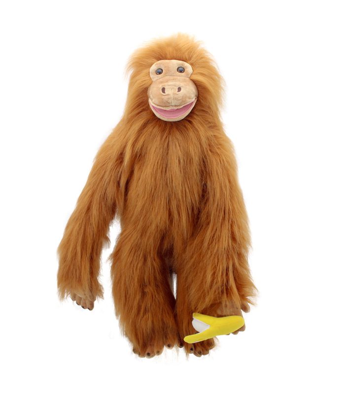 בובת כפפה אורנגאוטן ענקית עם הבעה שובבה על הפנים, באיכות גבוהה ועם פרטים מושלמים, עשוייה בד יפהפה ונעים.