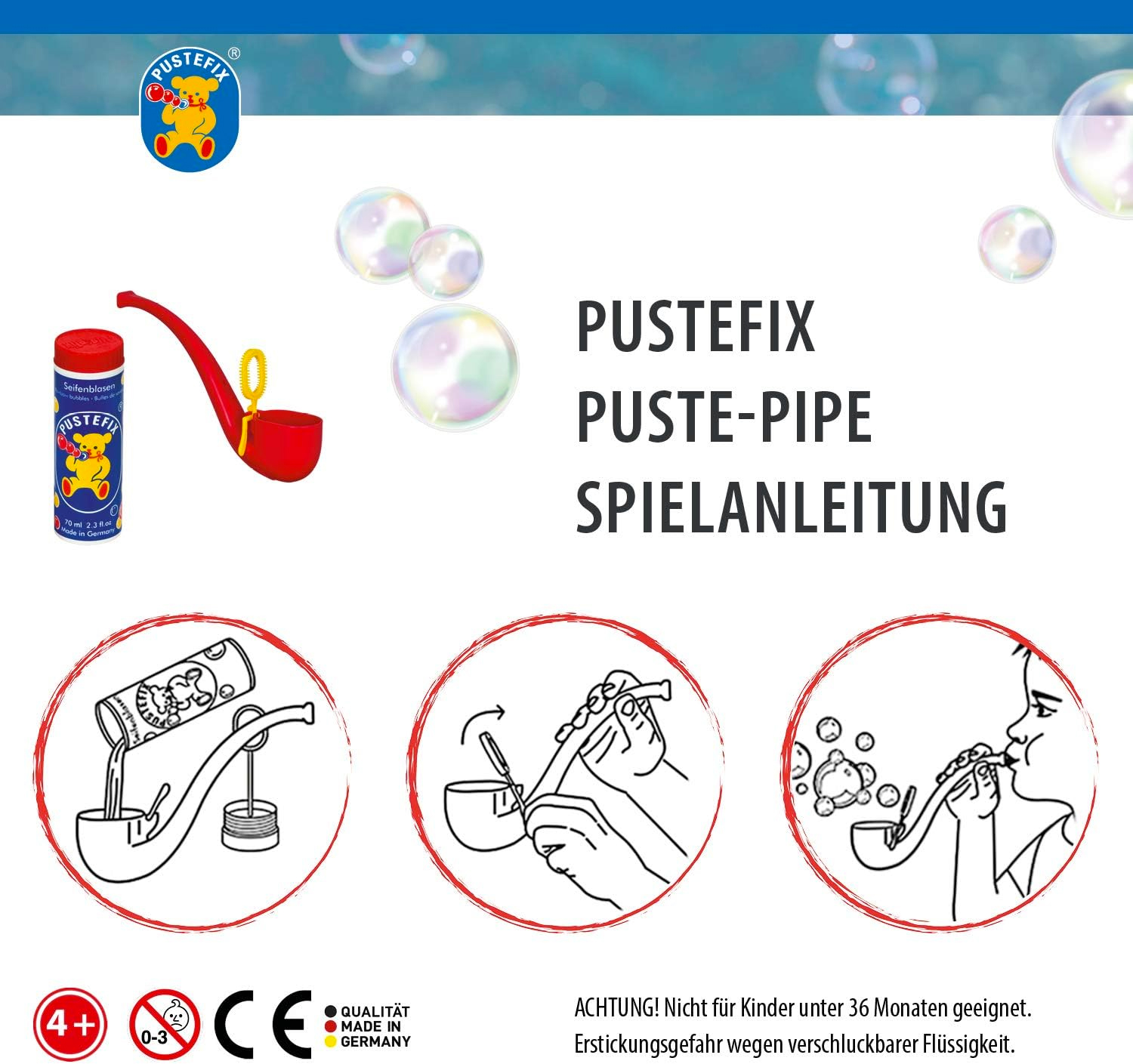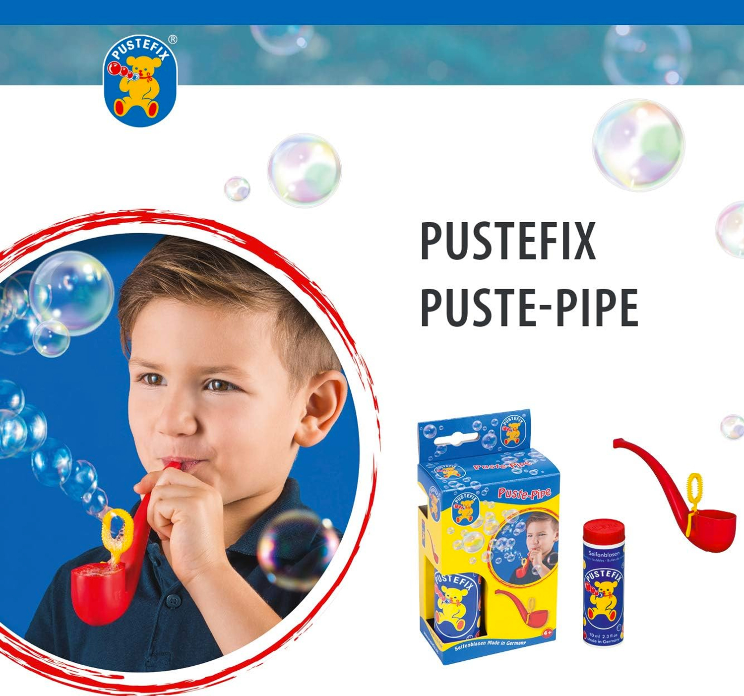 מקטרת בועות – עם 70 מ”ל תמיסת בועות מבית Pustefix – חברת בועות הסבון הטובה בעולם! 🌈 💦