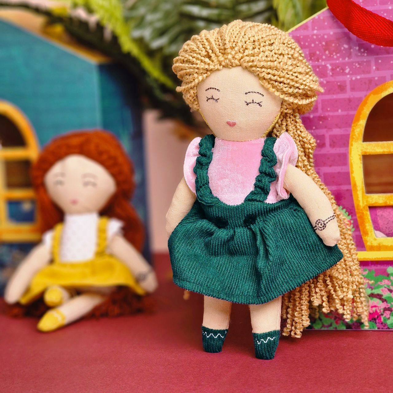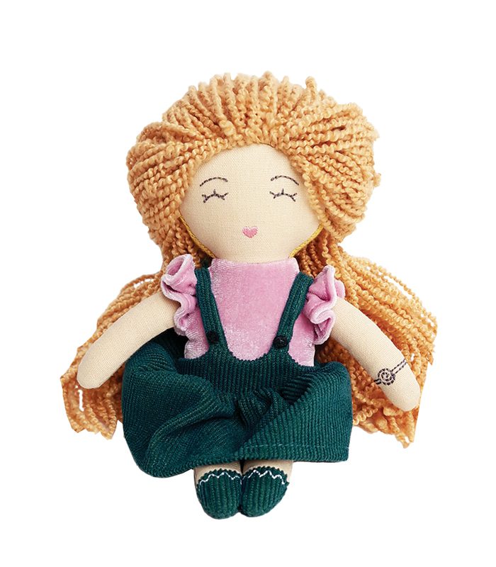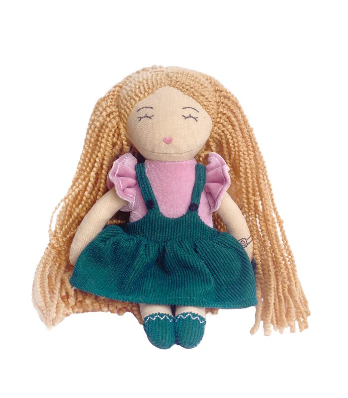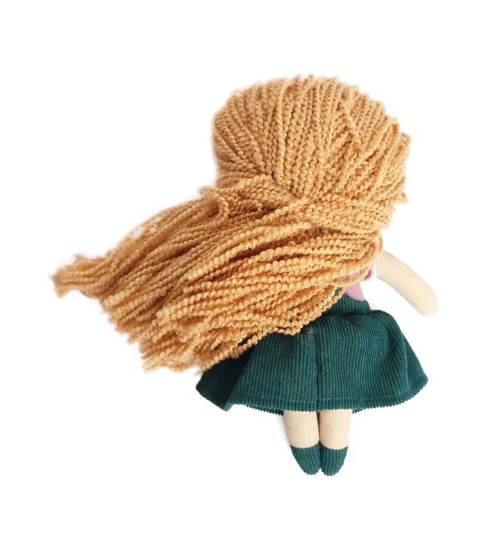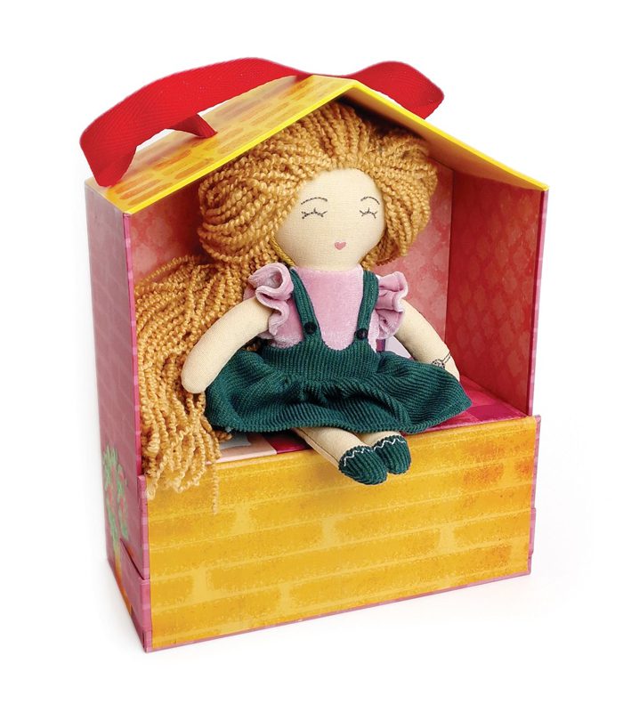 הבובה המצורפת, אנני, באורך 20 ס”מ, עם תווי פנים רקומים, שיער גולש ארוך ובלונדיני, אוברול מכותנה וחולצת מלמלה הניתנת להסרה.