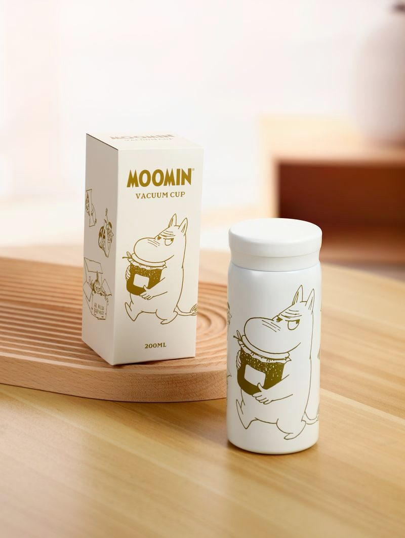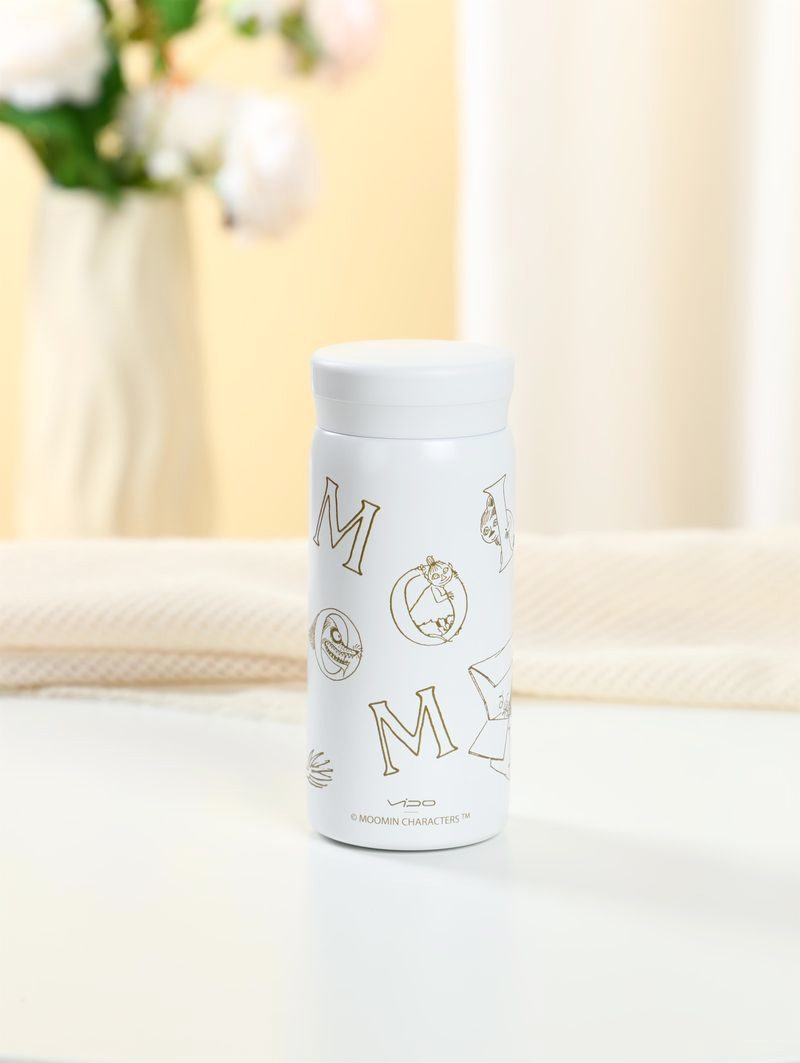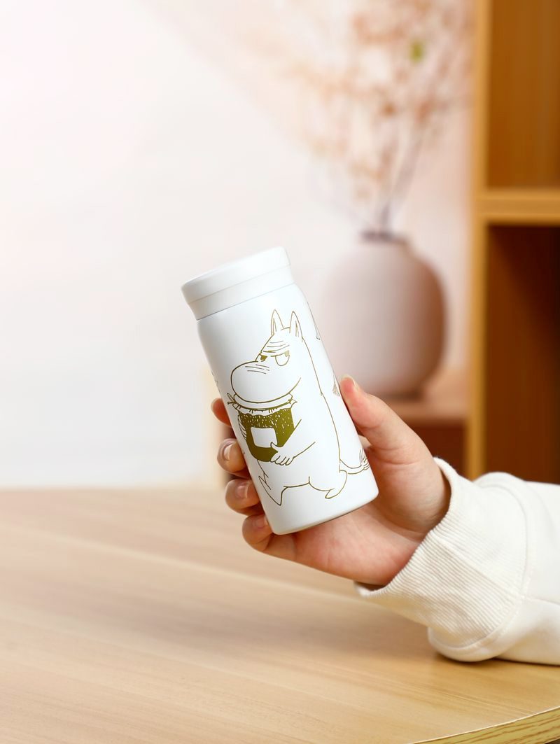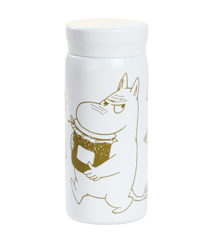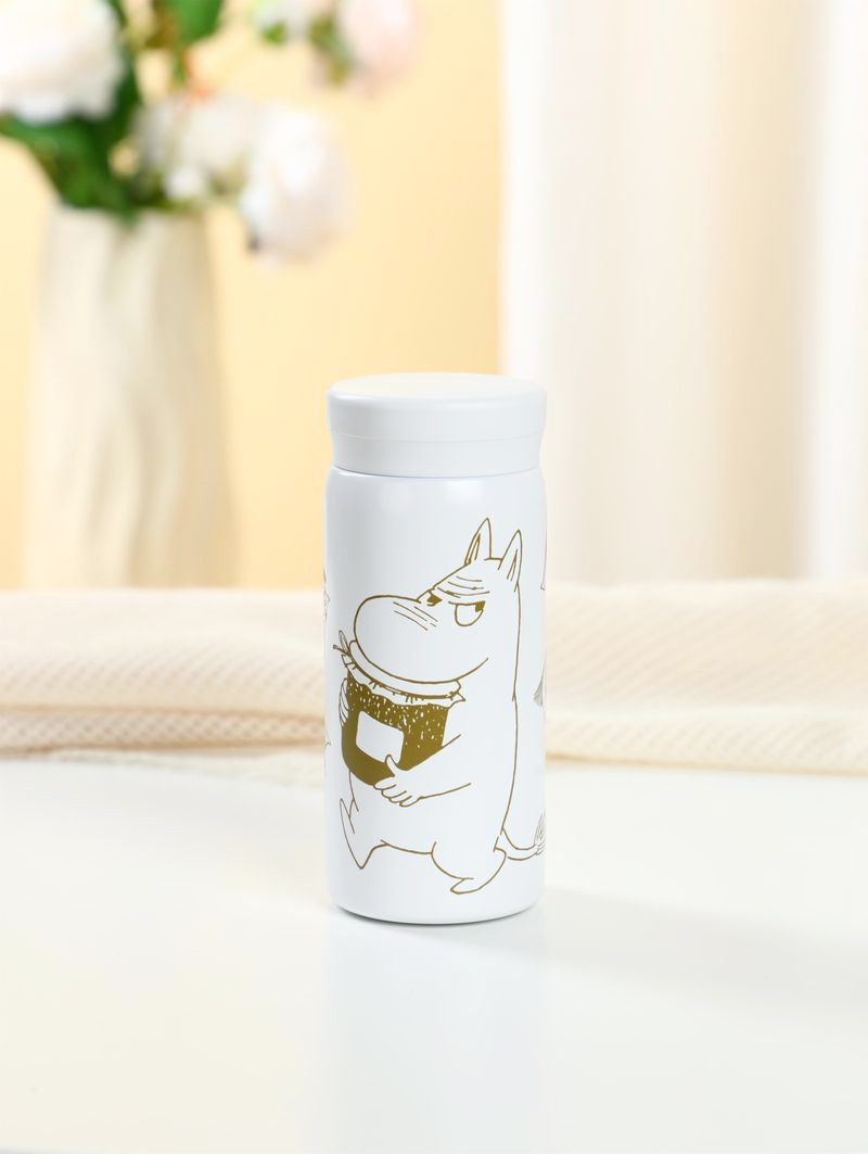 בקבוק/ תרמוס קומפקטי עם איור אלגנטי ומוזהב של מומין, בעיצוב פרשי וצעיר עם טאצ’ נוסטלגי ותמים.