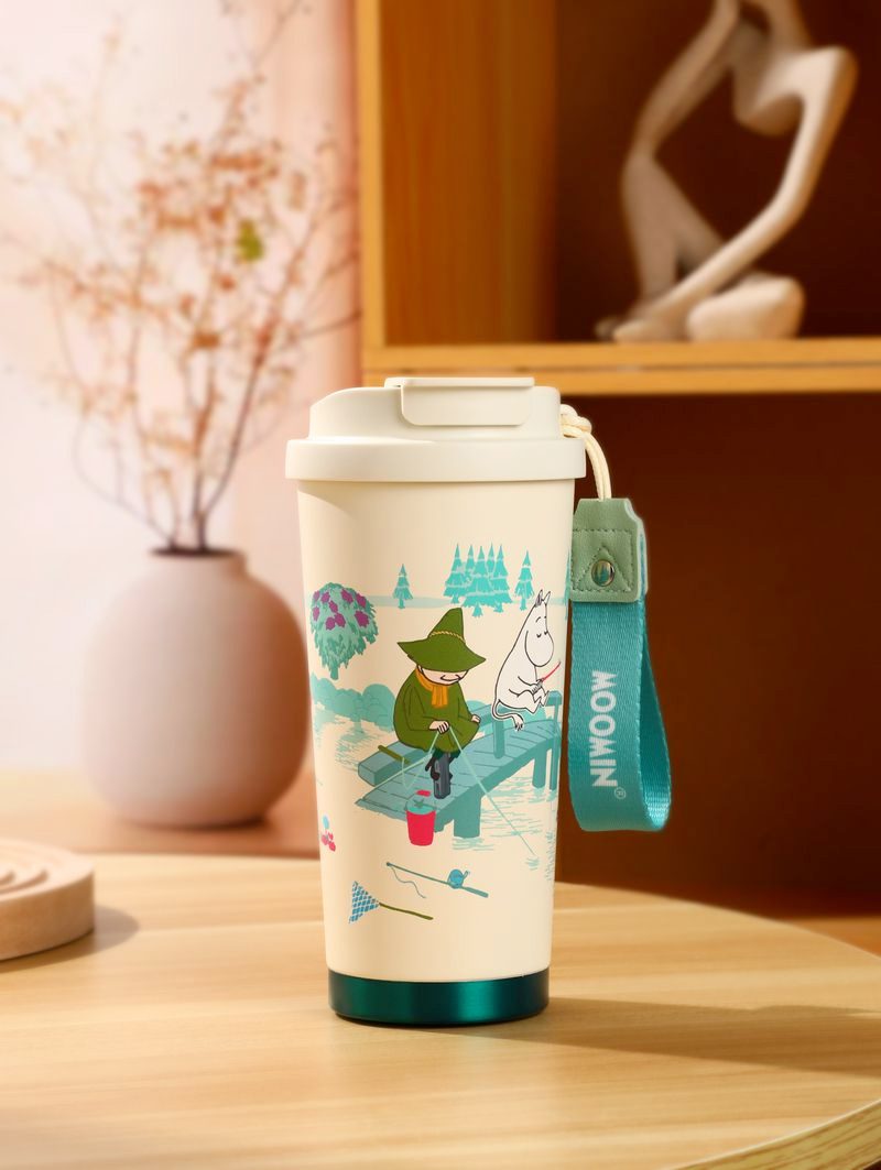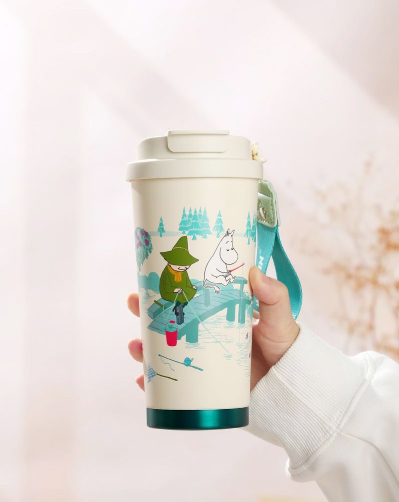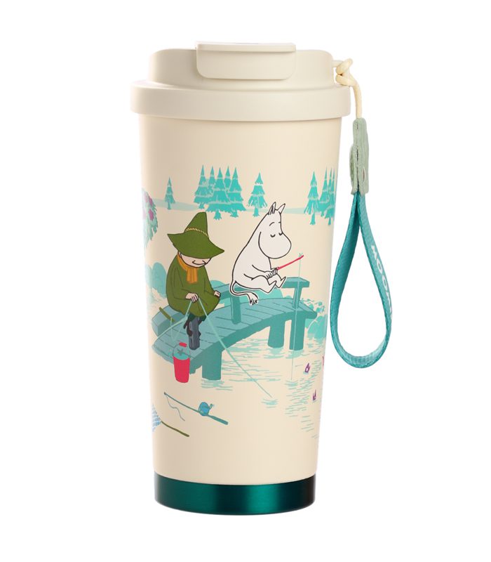 ספל תרמי מעוצב שעליו איור של מומין וסנופקין יושבים על גדות האגם בעמק המומינים ודגים.