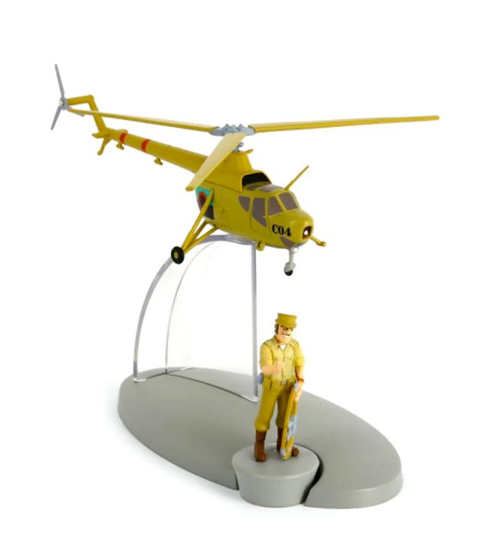 דגם מסוק אייקוני עשוי פולירזין, ולידו דמות מקולקציית האספנות של Editions Moulinsart שבה דגמים שנבחרו בקפידה מתוך מסעות טין טין.