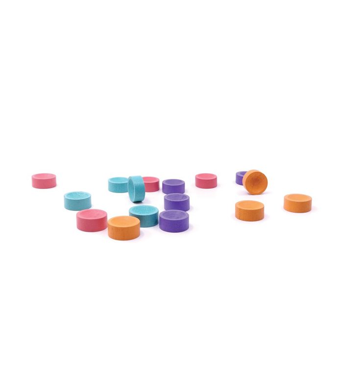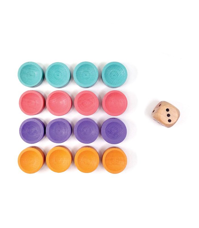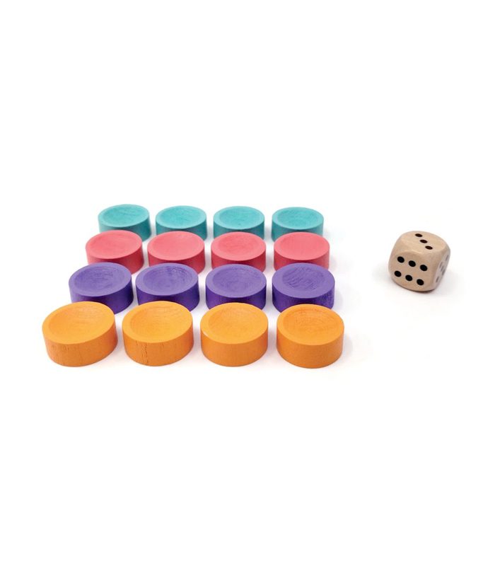 במארז תמצאו את לוח משחק דו-צדדי מעץ, 3 גומיות, 16 מטבעות עץ בארבעה צבעים שונים, קובייה והוראות בעברית .