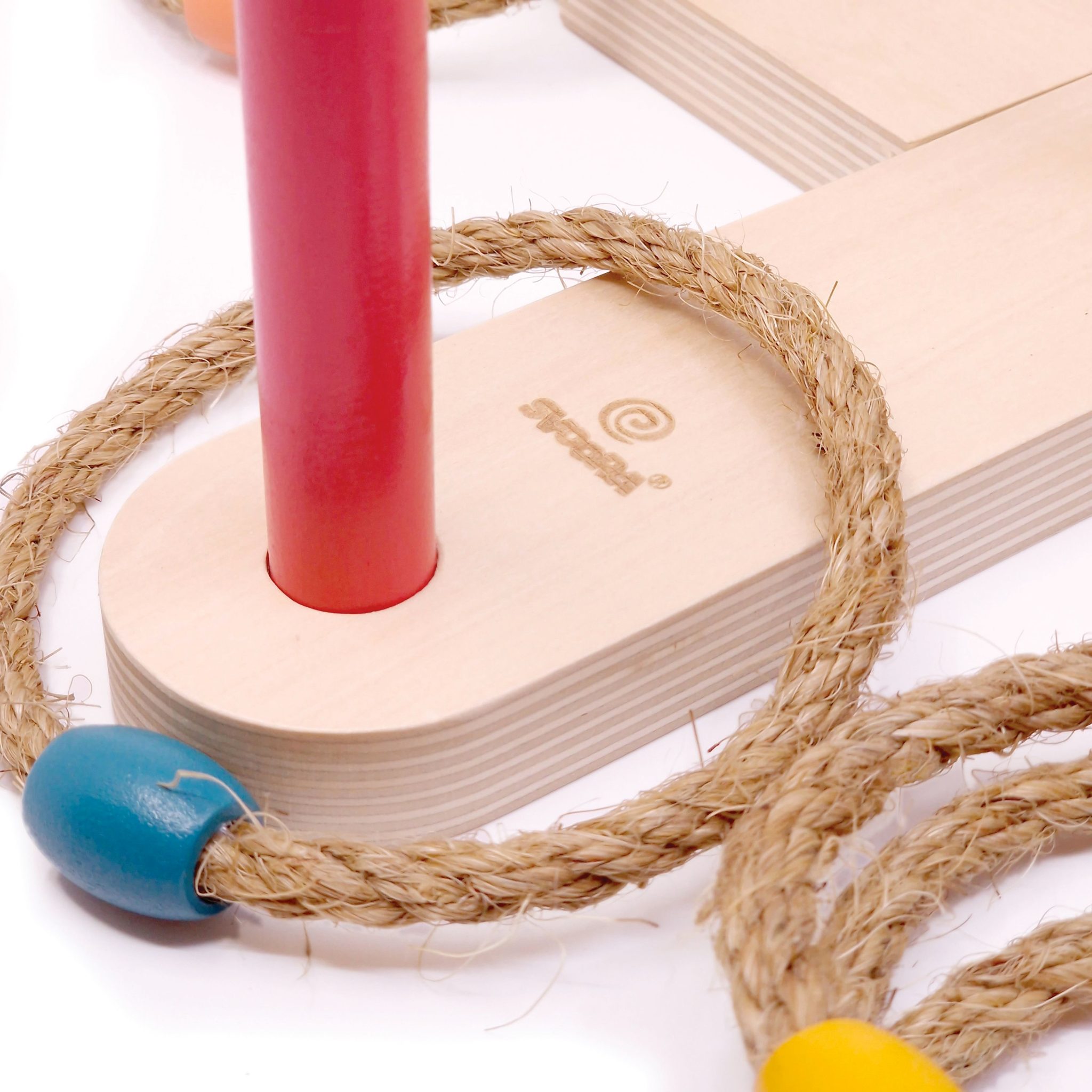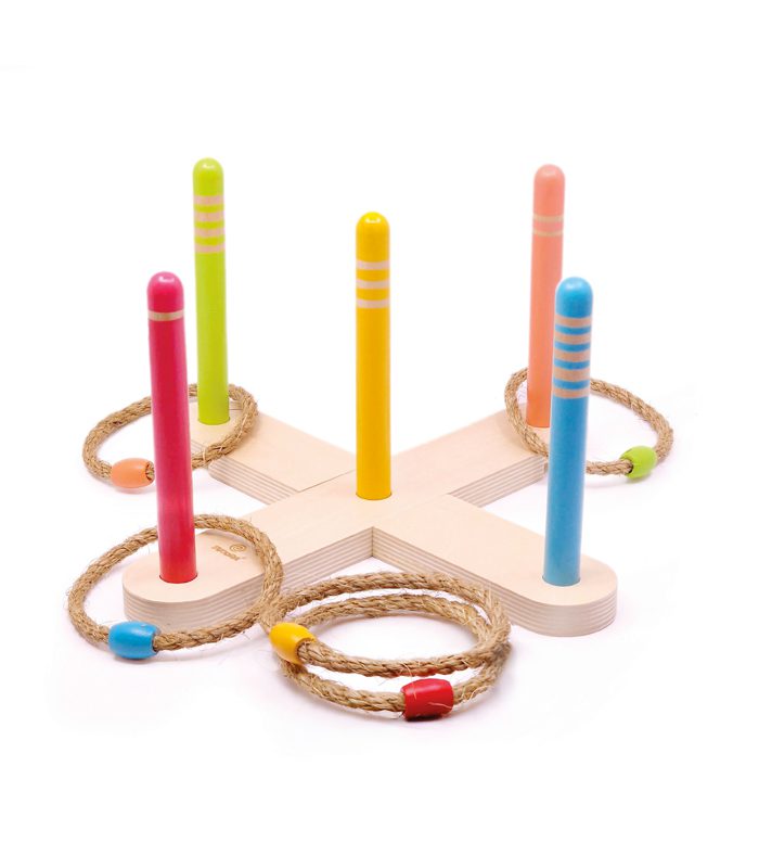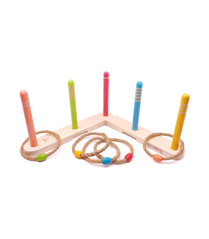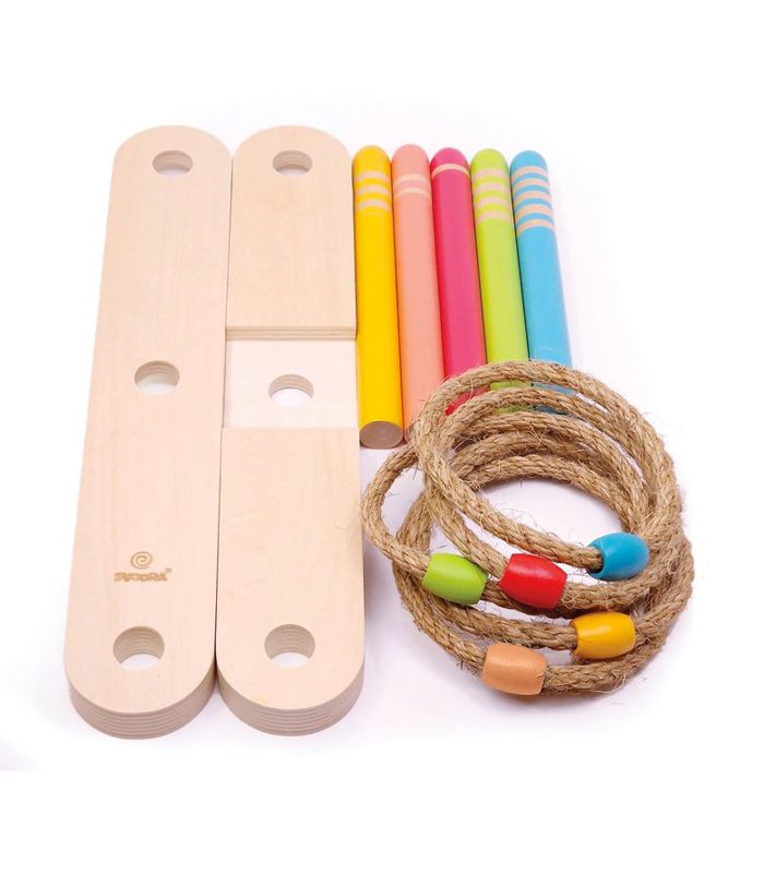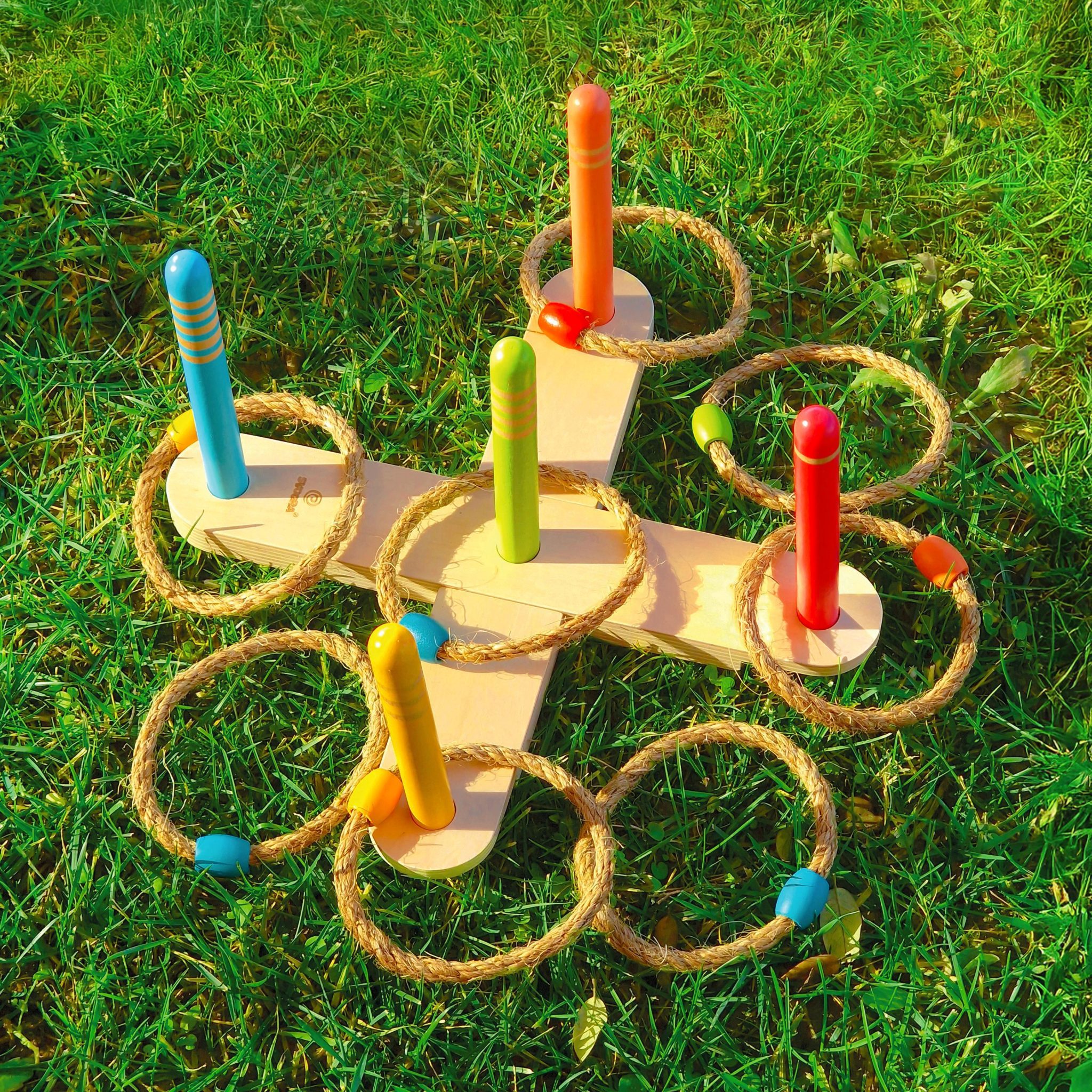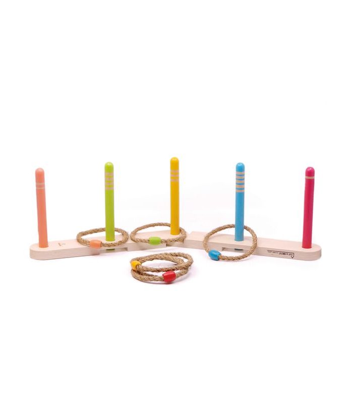 בערכה 5 טבעות חבל מבד ובסיס עץ יציב עם מטרות צבעוניות.