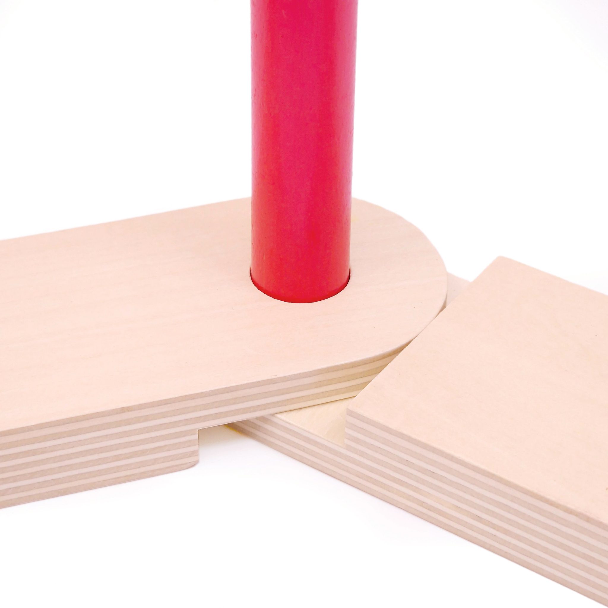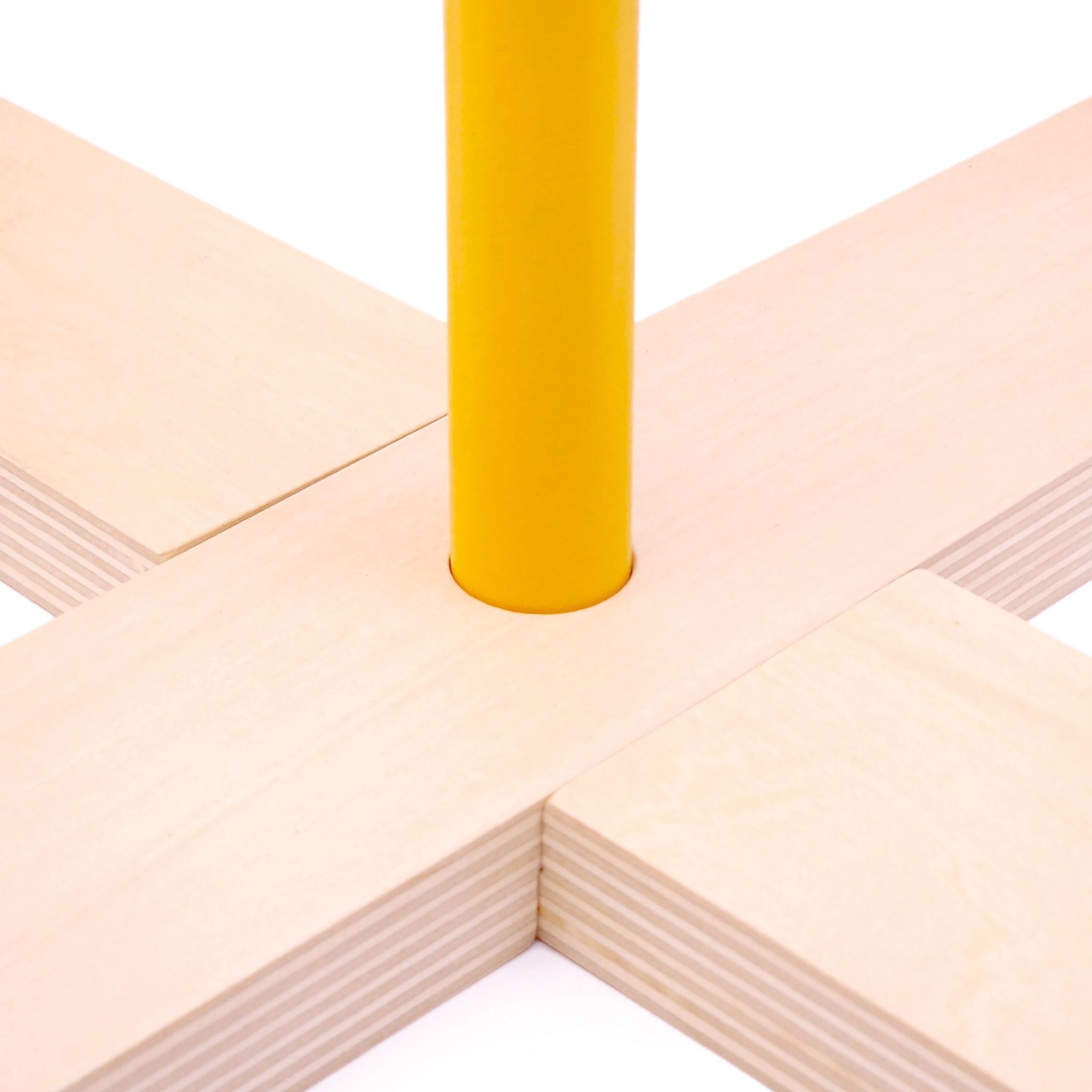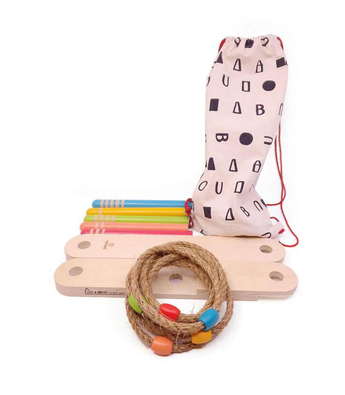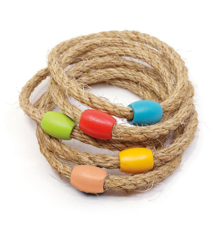 בערכה 5 טבעות חבל מבד ובסיס עץ יציב עם מטרות צבעוניות.