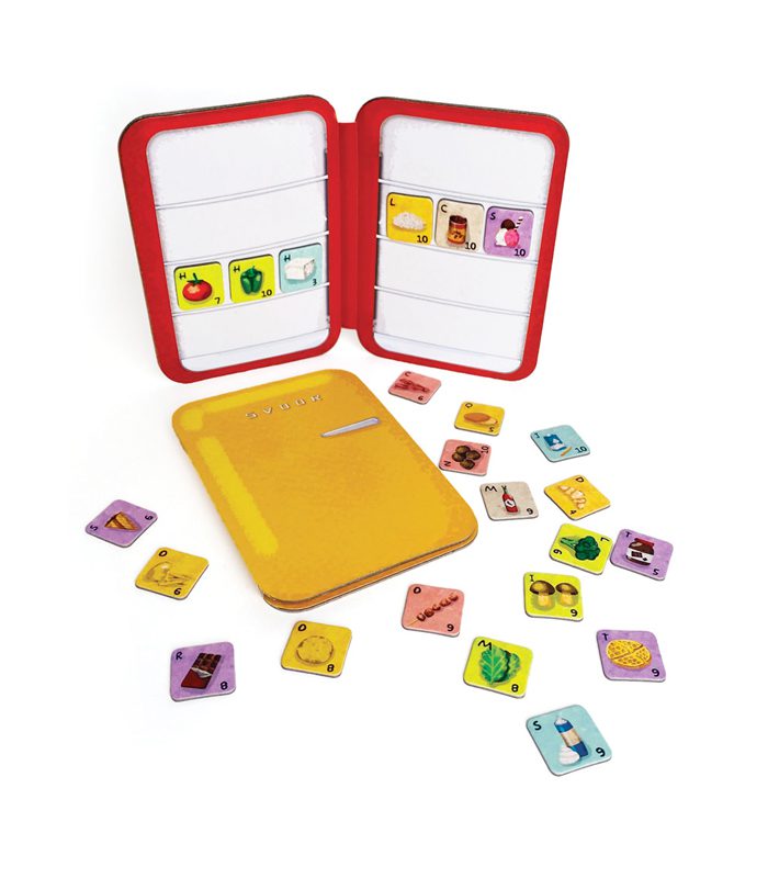 מה במקרר? 4 לוחות מקרר מגנטיים, 64 מצרכים מגנטיים, כרטיס מלאי וכרטיס ארוחות.
