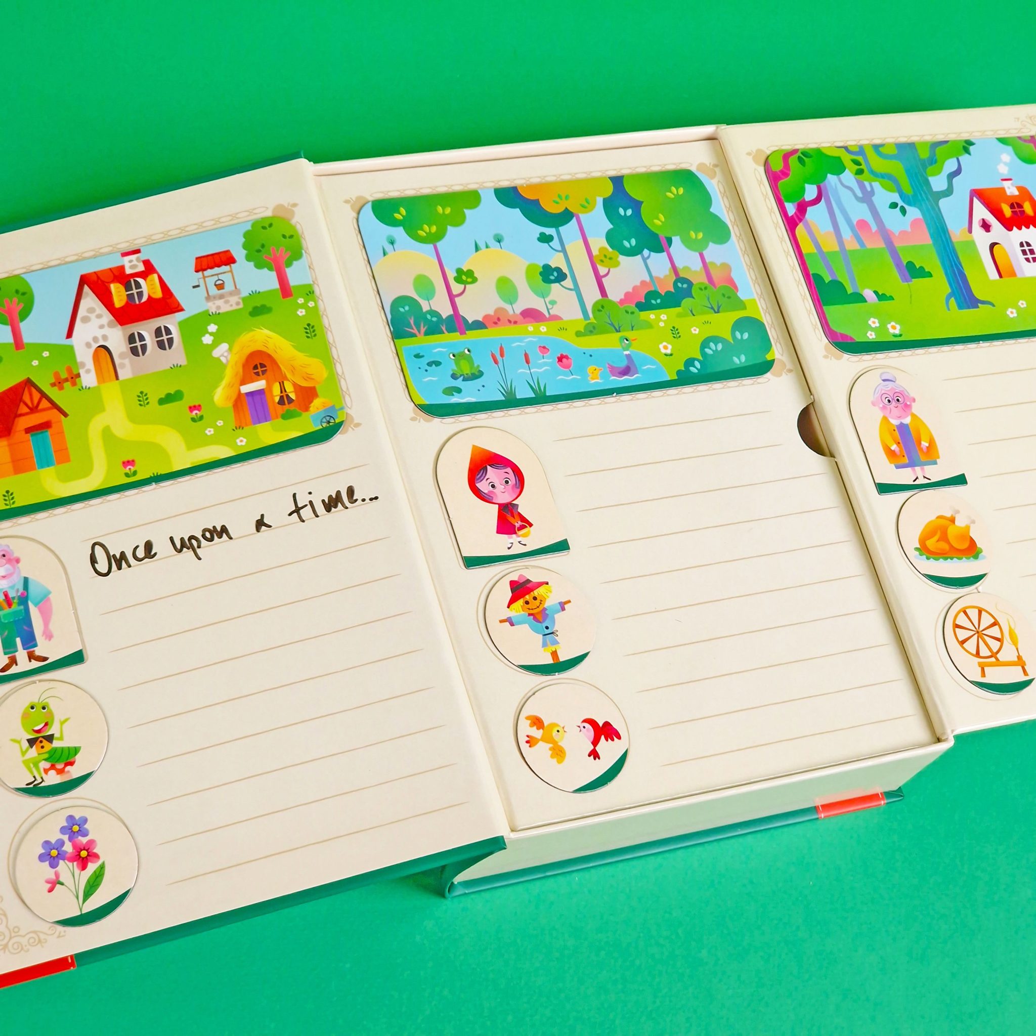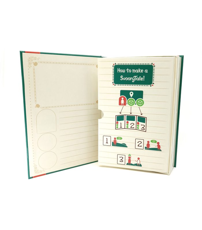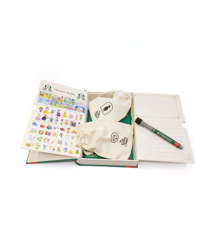 מה בערכה? הספר עצמו, 8 כרטיסיות מגנטיות עם רקעים לסיפור, 16 אסימוני דמויות, ו-32 אסימוני חפצים ואובייקטים שונים.