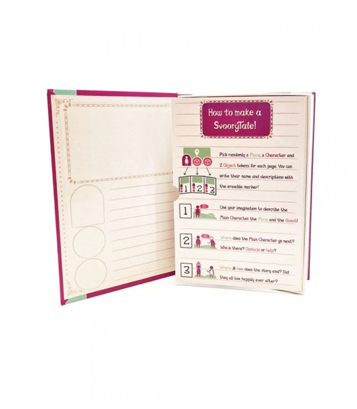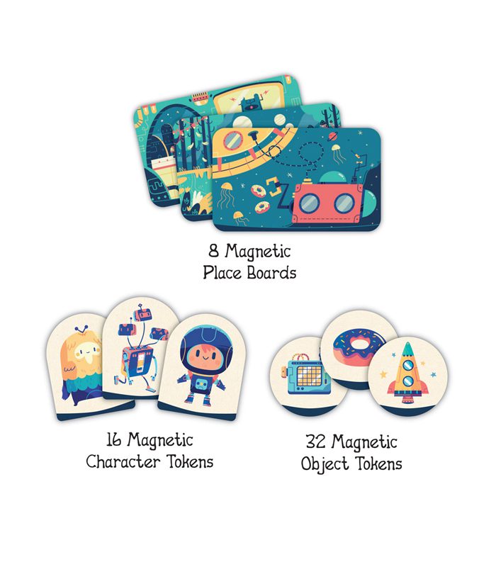 מה בערכה? הספר עצמו, 8 כרטיסיות מגנטיות עם רקעים לסיפור, 16 אסימוני דמויות, ו-32 אסימוני חפצים ואובייקטים שונים.
