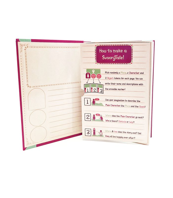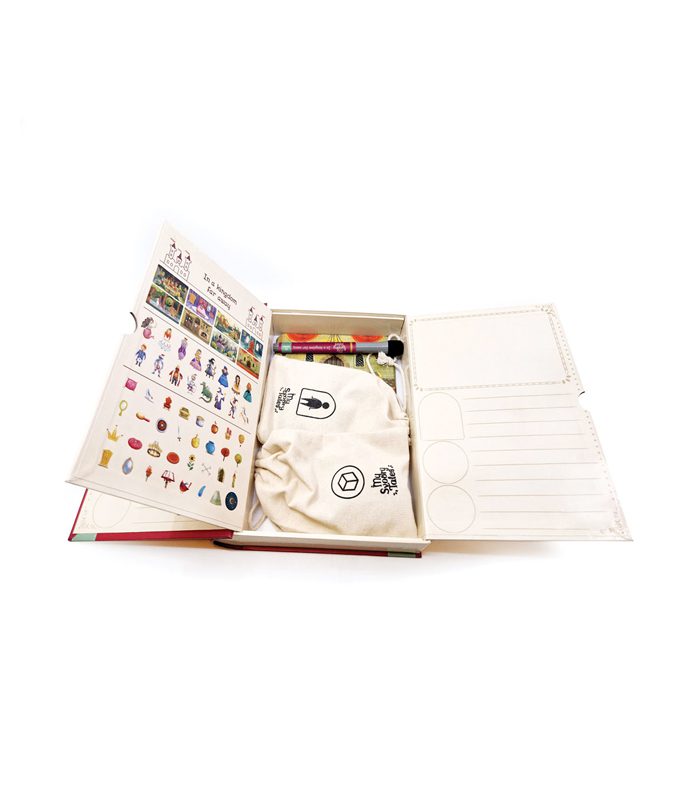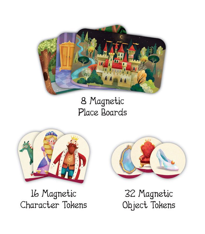 מה בערכה? הספר עצמו, 8 כרטיסיות מגנטיות עם רקעים לסיפור, 16 אסימוני דמויות, ו-32  אסימוני חפצים ואובייקטים שונים.