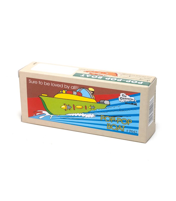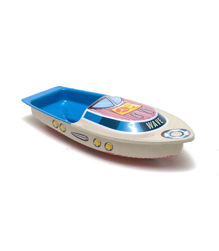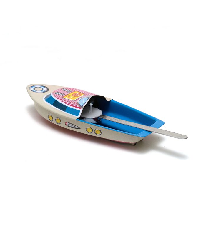 צעצוע פח נדיר בסגנון וינטג’, של סירת פח צבעונית ששטה בעזרת מכניקה חכמה ופשוטה שלא השתנתה לאורך שנים.