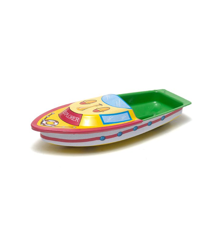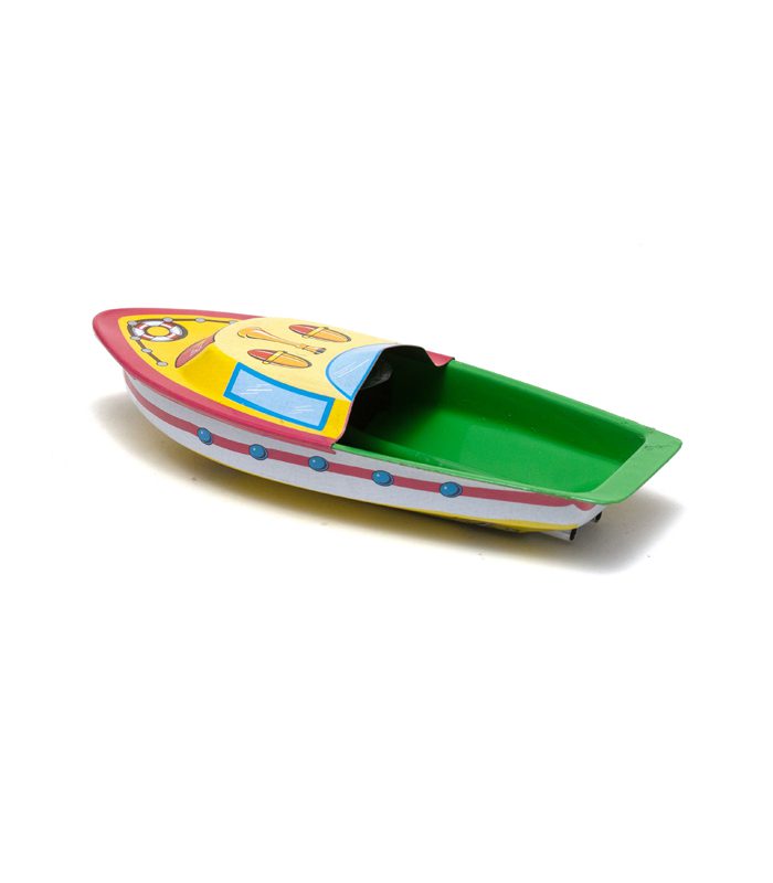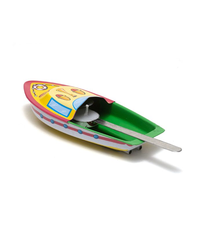 צעצוע פח נדיר בסגנון וינטג’, של סירת פח צבעונית ששטה בעזרת מכניקה חכמה ופשוטה שלא השתנתה לאורך שנים.