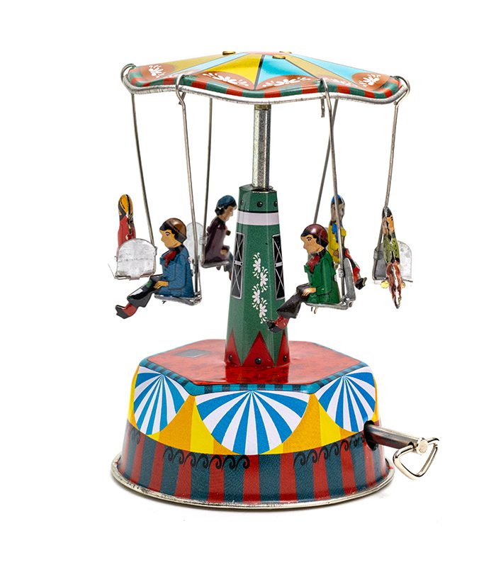 מתקן הקרוסלה הקלאסי עשוי פח, בעיצוב צבעוני ונוסטלגי מבית היוצר של Tin Treasure!