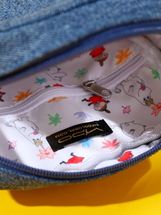 תיק צד שעליו רקמה עדינה של מומין מבד דנים משובח, ומתוכו מציצה בטנה מאוירת וצבעונית עם הדפס מתוק של מומינים וחברים.
