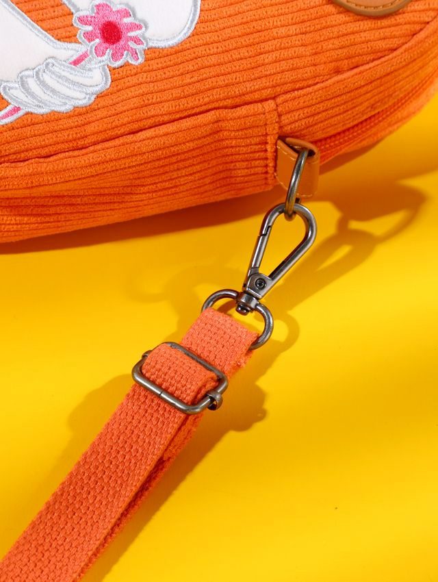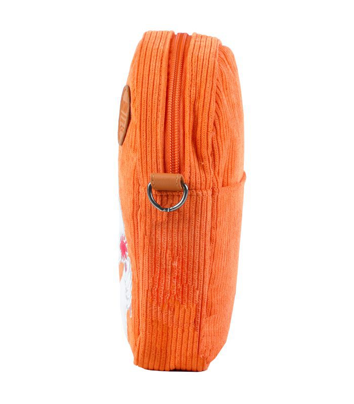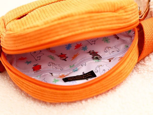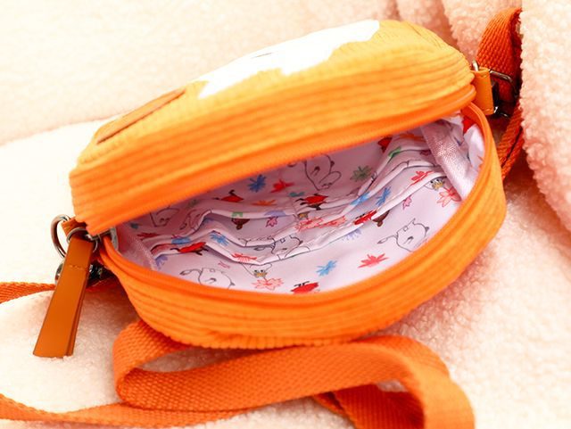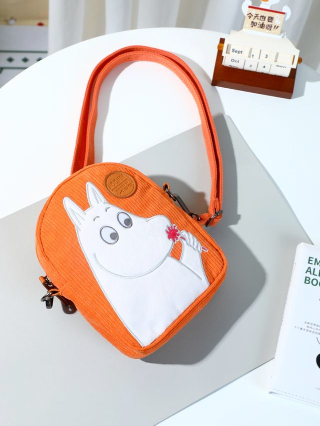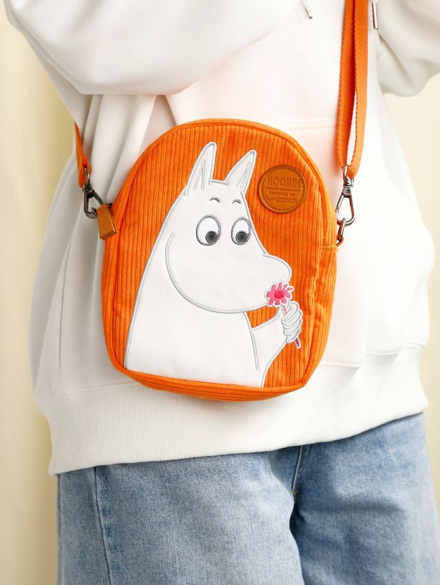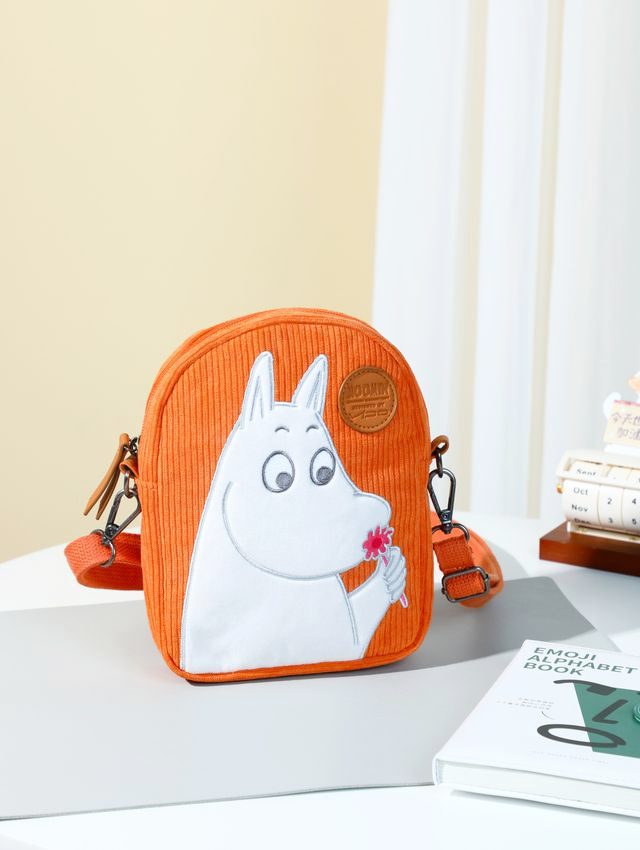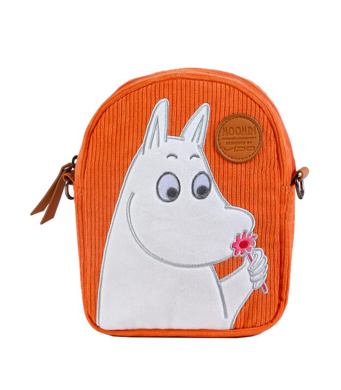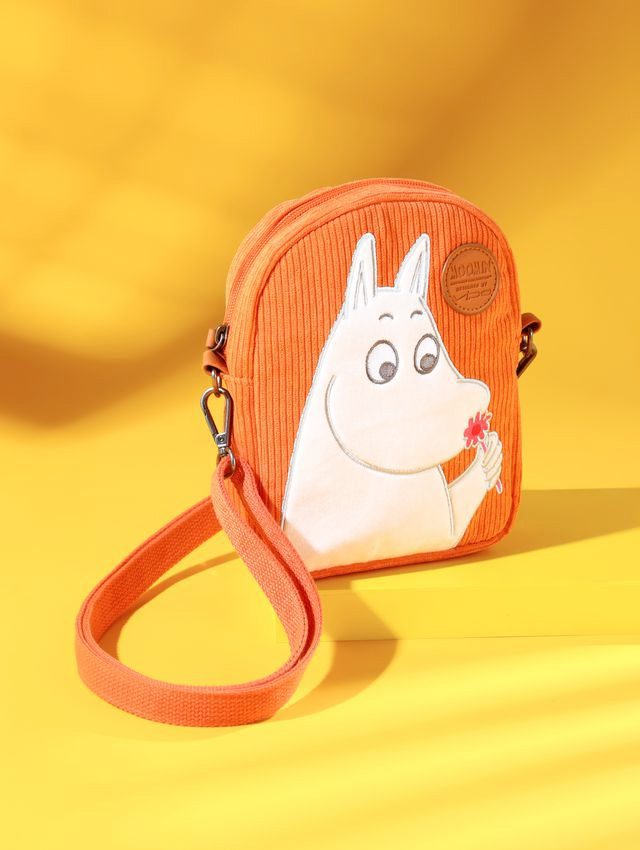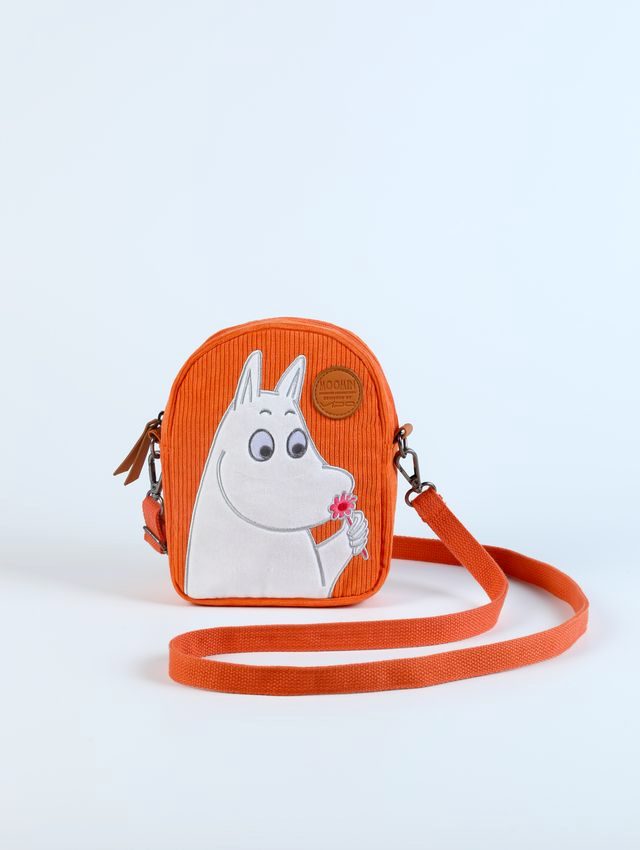 תיק צד מקורדרוי שעליו מומין מרחרח פרח, ומתוכו מציצה בטנה מאוירת וצבעונית עם הדפס מתוק של מומינים וחברים.