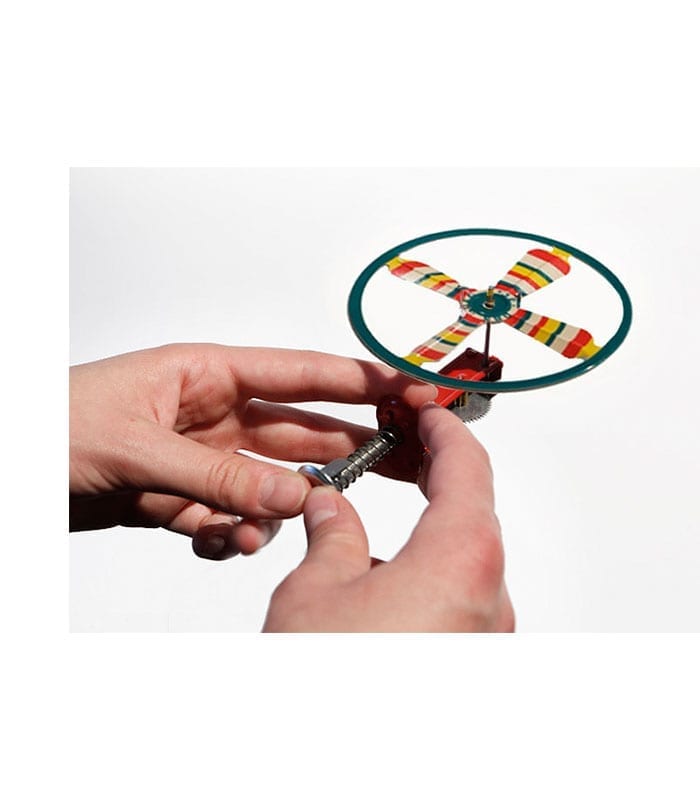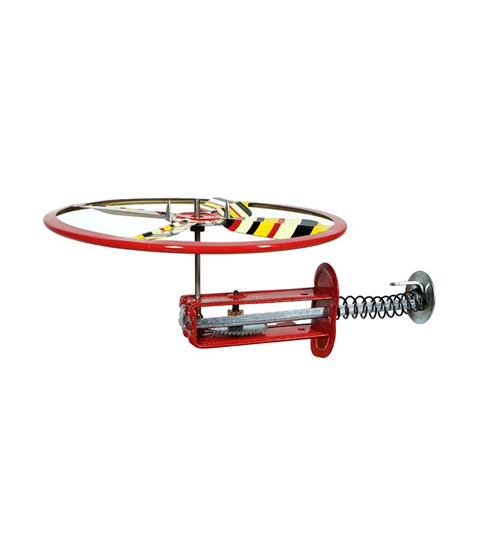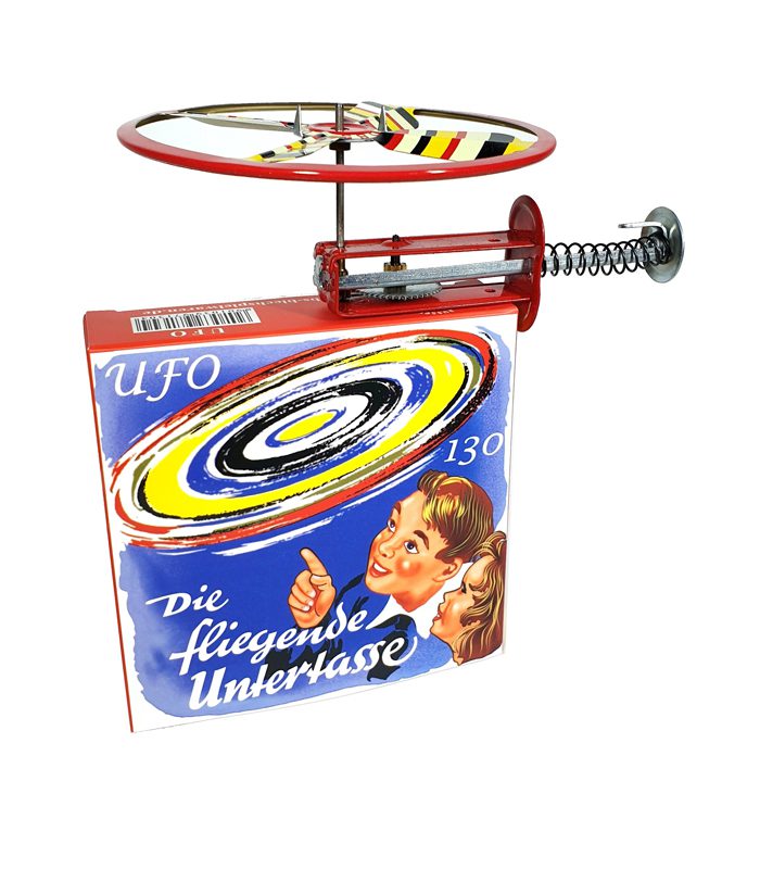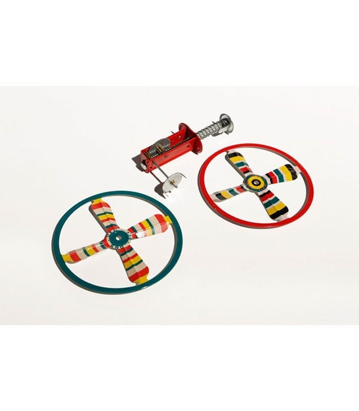 צעצוע פח מהנה במיוחד של דיסק מעופף הכולל משגר ו-2 דיסקים בצבעים שונים.