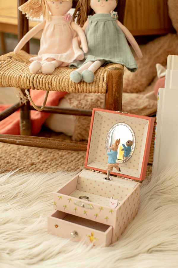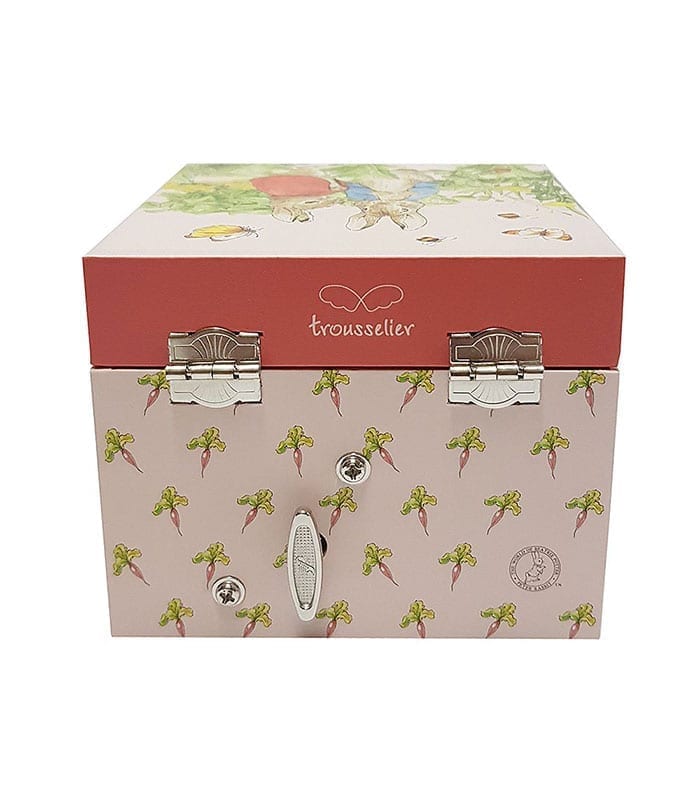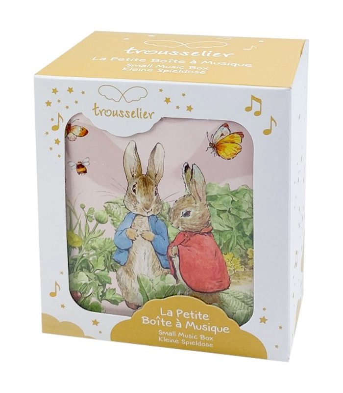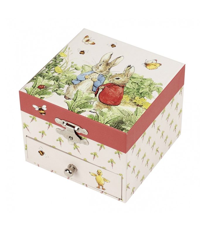 תיבת נגינה מתוקה עם איורים של פיטר הארנב השובב מתוך הסיפורים של ביאטריקס פוטר מ-1902.
