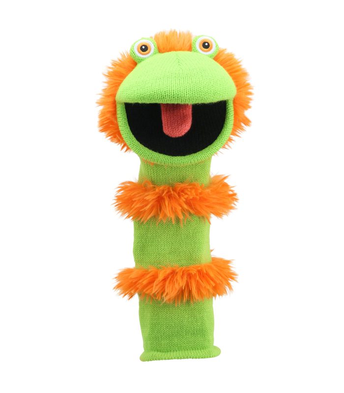 בובת כפפה סרוגה וחביבה עם פנים ידידותיות גדולות. ג’ינג’ר עשויה מבד סרוג יפיפה שנוצר מ-100% בקבוקים ממוחזרים (!) הוא נעים ורך, בגוון ירוק, ועם פרווה בכתום בוהק.