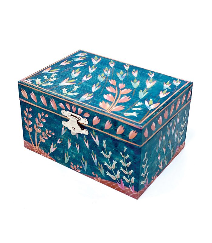 תיבת נגינה קלאסית בעיצוב רומנטי וייחודי, מעוטרת בדיטיילס מוזהבים שהיא גם קופסת תכשיטים עם מקום לכל מה שחשוב, טבעות, צמידים ושרשראות אהובות.