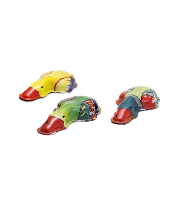 צעצוע פח מקסים ונוסטלגי של ברווז מבית Tin Treasures, שהוא גם מוסיקלי וגם דקורטיבי.
