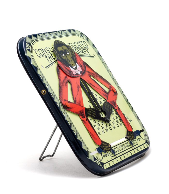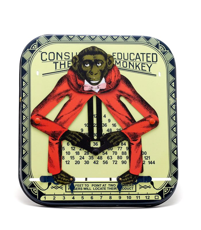 קוף לוח הכפל המיתולוגי עשוי פח בעיצוב נוסטלגי בהשראת המקור מ-1908.