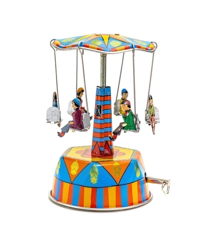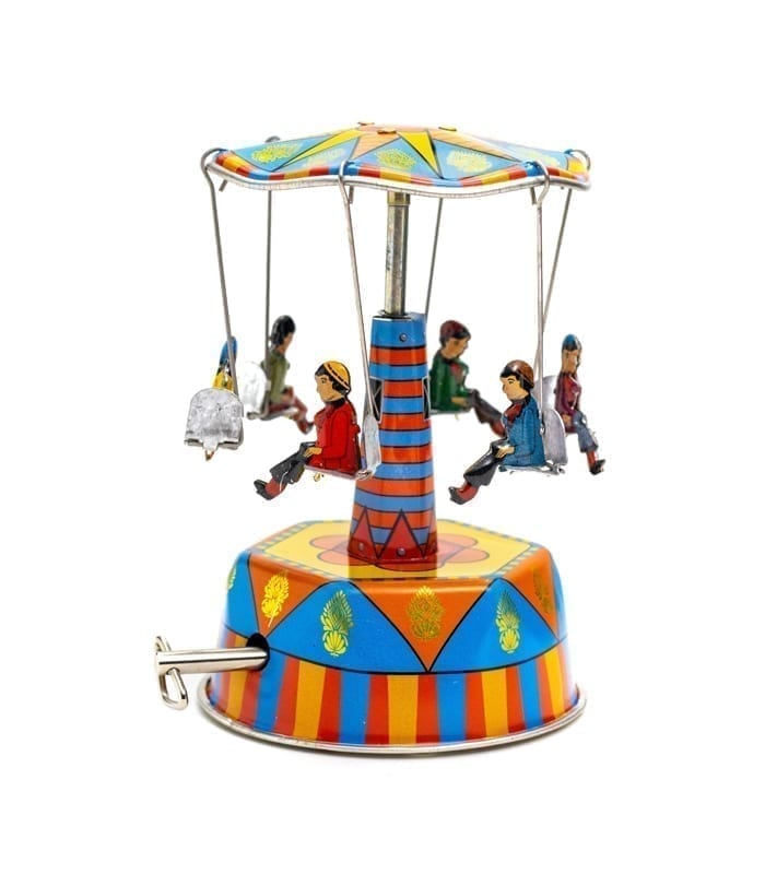 מתקן הקרוסלה הקלאסי עשוי פח בעיצוב צבעוני ונוסטלגי מבית היוצר של Tin Treasure!