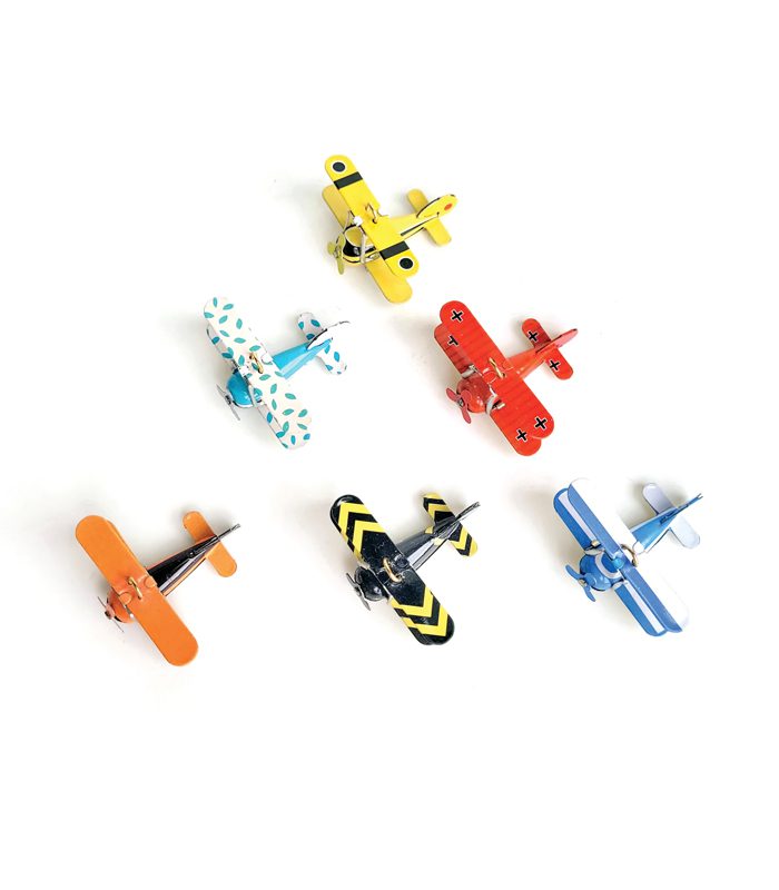 צעצוע פח צבעוני ונוסטלגי בהשראת עיצובי מטוסים משנות ה30.