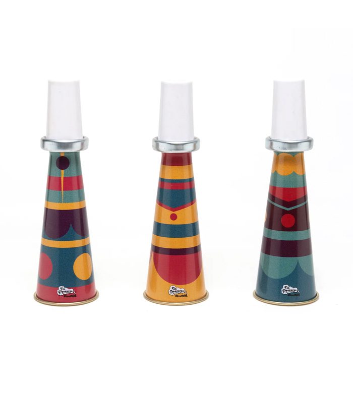 חצוצרה עשויה פח בעיצובים צבעוניים ונוסטלגיים מבית היוצר של TIN TREASURES.